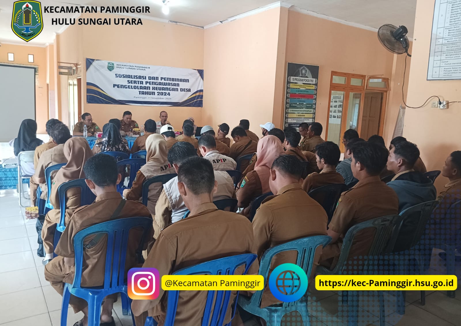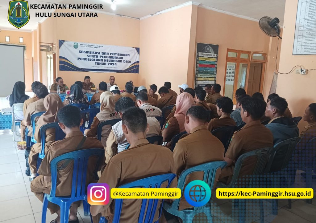 Paminggir-Inspektorat Daerah Kabupaten Hulu Sungai Utara melaksanakan kegiatan Sosialisasi dan Pembinaan Serta Pengawasan Pengelolaan Keuangan Desa Se-Kecamatan Paminggir Tahun 2024, Pada Kegiatan ini Inpektorat Daerah dihadiri langsung oleh Inspektur Bapak Fahrudin,S.Hut.,MS.,CGCAE dan Wakil Penanggungjawab/Dalnis: Irban III Ibu Hj.Agustini,S.Sos.,MM, Camat Paminggir Bapak Rully Lesmana,.SSTP,MAP, Sekretaris Kecamatan Bapak H. Akhmad Yani,S.Sos,MA Serta Kasi Pemerintahan, Pembangunan dan Pemberdayaan Masyarakat Bapak Musaffa Kamal,S.Ag.