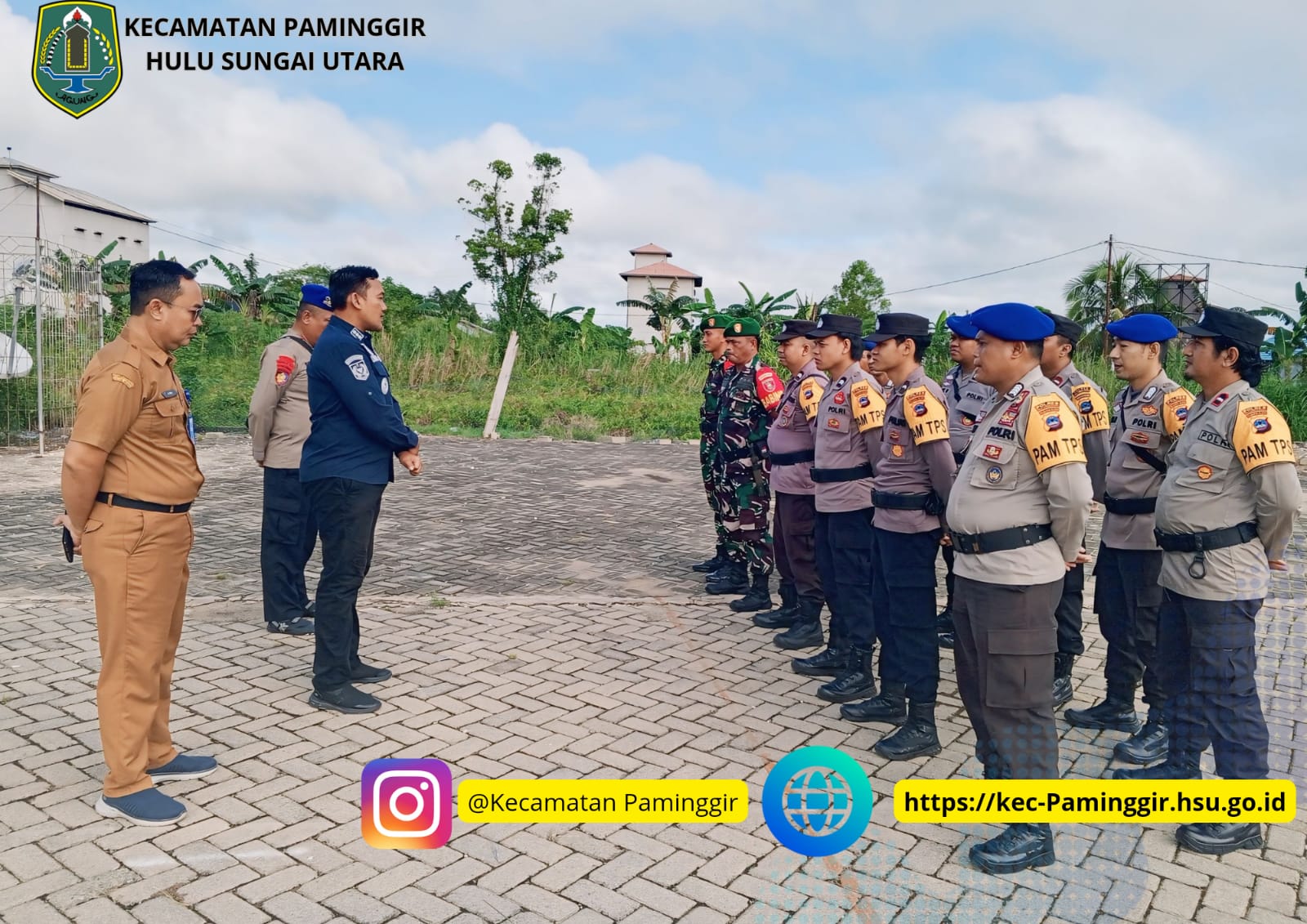Paminggir – Camat Paminggir Bapak Rully Lesmana,SSTP,MAP didampingi Sekretaris Kecamatan Bapak Akhmad Yani,S.Sos.MA menggelar Apel Gelar Pasukan Pengaman Pemilu bersama SAT POLAIRUD POLRES HSU dan DANPOS KORAMIL Paminggir di Halaman Kantor Kecamatan Paminggir, Pada hari Selasa (26/11/2024).