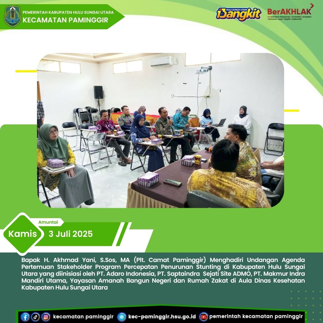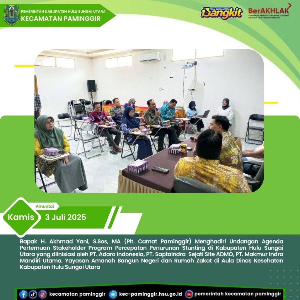 Paminggir, Kamis 3 Juli 2025 Bapak H. Akhmad Yani,S.Sos,MA sebagai Plt.Camat Paminggir menghadiri Undangan Agenda Pertemuan Stakeholder Program Percepatan Penurunan Stunting di Kabupaten Hulu Sungai Utara yang diinisiasi oleh PT.Adaro Indonesia, PT. Saptaindra Sejatisite ADMO, PT.Makmur Indra Mandiri Utama, Yayasan Amanah Bangun Negeri dan Rumah Zakat di Aula Dinas Kesehatan Kabupaten Hulu Sungai Utara.